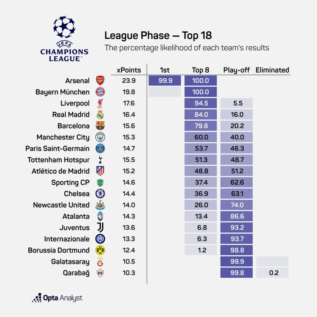 Arsenal lidera con un 93.9% de chances de terminar primero, seguido de Bayern Múnich y Manchester City.